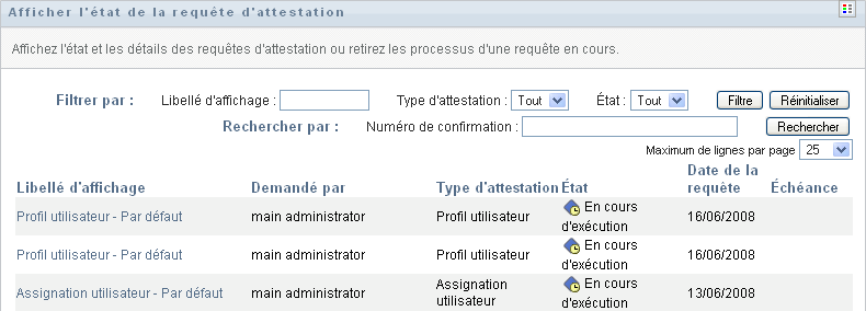 L'application utilisateur n'impose aucune restriction sur ce que l'administrateur de conformité peut voir sur la page Afficher l'état de la requête d'attestation. Ce rôle permet d'accéder aux informations d'état de toutes les requêtes d'attestation.