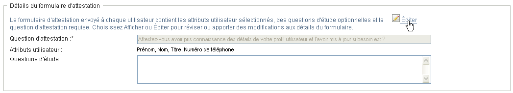 La question d'attestation est une question obligatoire quel que soit le processus d'attestation. Cette question permet au chargé d'attestation de valider ou d'invalider les données. La réponse à la question est oui ou non. Vous devez définir une question d'attestation lors du lancement des processus d'attestation ; chaque chargé d'attestation doit répondre à cette question pour compléter sa réponse.