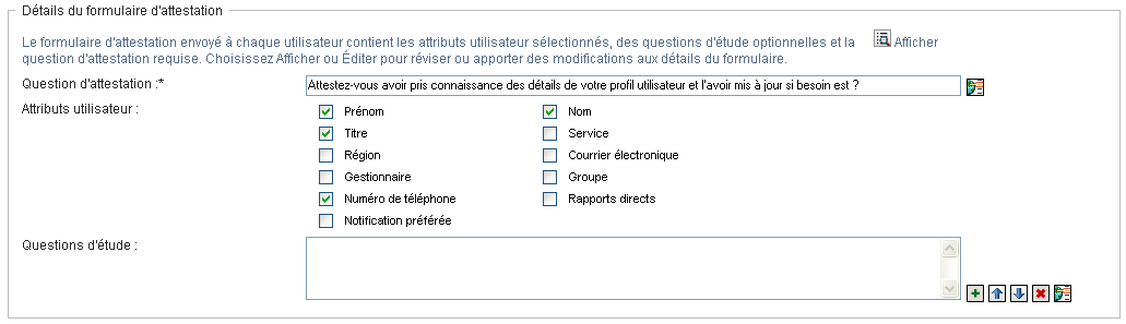 Le champ permet ajouter une ou plusieurs questions facultatives auxquelles un chargé d'attestation peut répondre au cours de l'exécution d'un processus d'attestation. Un processus d'attestation n'est pas obligatoire pour pouvoir inclure des questions d'enquête. Toutefois, si elles sont incluses, le chargé d'attestation peut éventuellement y répondre.