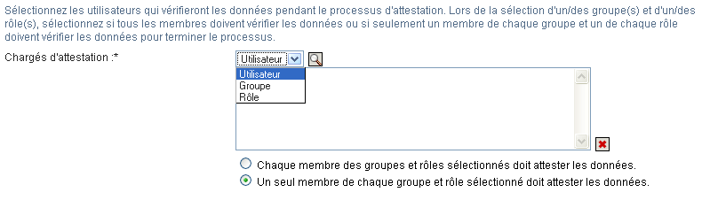 Pour les chargés d'attestation de groupes et de rôles, indiquez si tous les membres doivent valider les données ou si un seul membre suffit dans chaque groupe et dans chaque rôle en cliquant sur l'un des boutons suivants :