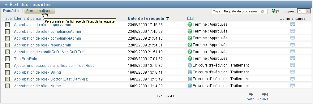 REMARQUE :si l'horloge système du serveur où réside le pilote de service de rôle n'est pas synchronisée avec celle du serveur où l'application utilisateur s'exécute, l'état des requêtes peut être différent sur les listes État des requêtes et Assignations de rôles. Par exemple, si vous effectuez une requête d'assignation de rôle qui ne nécessite pas d'approbation, l'état dans la section État des requêtes peut indiquer Provisionné, alors qu'il est défini sur Activation en attente dans la section Assignations de rôles. Si vous patientez environ une minute, vous constatez que l'état dans la section Assignations de rôles change et devient Provisionné. Pour vous assurer que l'état est affiché correctement dans l'application utilisateur, vérifiez que vos horloges système sont parfaitement synchronisées.