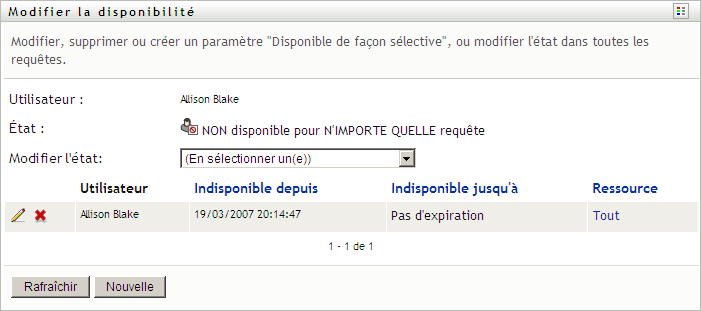 L'application utilisateur affiche un ensemble de contrôles destinés à préciser la période pendant laquelle vous n'êtes pas disponible et à sélectionner les requêtes auxquelles le paramètre s'applique.