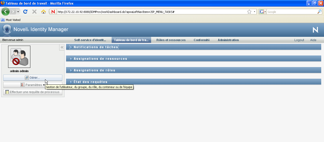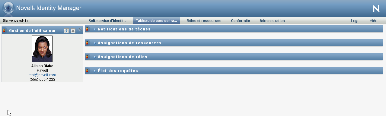 Lorsque vous sélectionnez un utilisateur, un groupe, un conteneur, un rôle ou une équipe, le tableau de bord de travail vous met en mode de gestion et met à jour la section Profil utilisateur du côté gauche de l'écran. Le profil utilisateur met à jour son écran, comme suit :