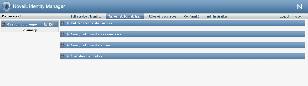 Lorsque vous sélectionnez un groupe, la section Profil utilisateur ainsi que les sections Notifications de tâches, Assignations de ressources, Assignations de rôles et État des requêtes de la page affichent cette icône :