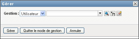 Lorsqu'un administrateur de domaine ou un gestionnaire de domaine se logue à l'application utilisateur, le tableau de bord de travail affiche le contrôle , qui est un contrôle de recherche global. Le contrôle permet à l'utilisateur actuel de sélectionner un utilisateur, groupe, conteneur, rôle ou membre de l'équipe particulier et d'utiliser l'interface de tableau de bord de travail afin de gérer le travail pour le type d'entité sélectionné. Après que l'utilisateur a sélectionné une entité, les autorisations de données et d'accès du tableau de bord de travail appartiennent à l'entité sélectionnée au lieu de l'utilisateur actuellement logué. Toutefois, lorsque l'utilisateur est en mode Gérer, les menus et s'appliquent toujours à l'utilisateur logué et non à l'entité sélectionnée dans le contrôle .