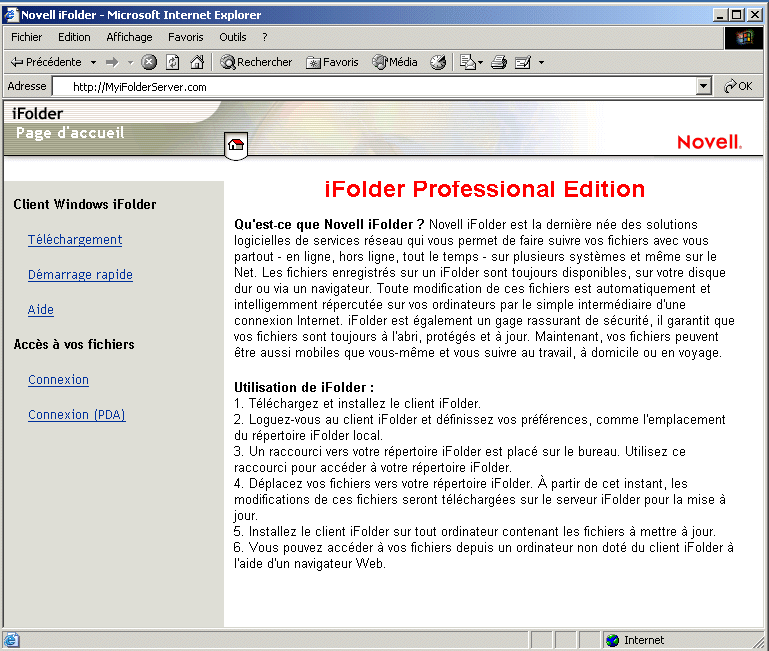 Ce site contient le guide de Démarrage rapide iFolder ainsi que d'autres informations importantes à propos de Novell iFolder. C'est également à partir de ce site que les utilisateurs téléchargent le client iFolder et accèdent à leurs fichiers iFolder à l'aide d'un navigateur (via l'applet Java ou l'accès HTML pour les PC de poche tels l'iPAQ*).