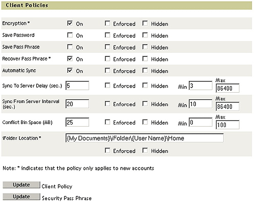 Par exemple, si vous imposez et masquez l'option permettant de demander le codage des données iFolder, les données seront codées et l'utilisateur ne se rendra pas compte de la transaction. Les options masquées ne s'affichent pas dans les boîtes de dialogue du client iFolder.