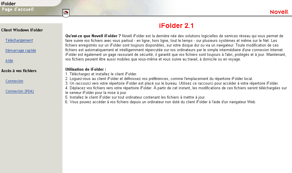C'est également à partir de ce site qu'ils peuvent télécharger le client iFolder et accéder à leurs fichiers iFolder à l'aide d'un navigateur (via l'applet Java ou l'accès HTML pour les PC de poche, par exemple l'iPAQ*).