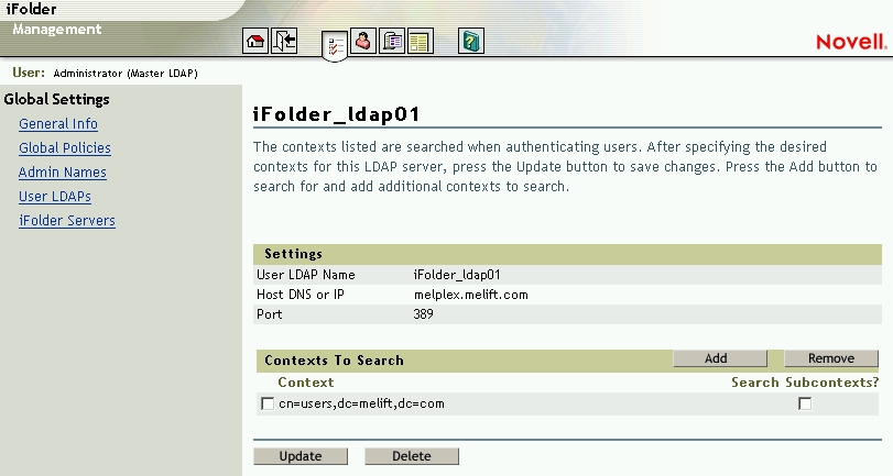 Global Settings > User LDAPS > Server Name > User Contexts for This Server (Paramètres globaux > Annuaires LDAP des utilisateurs > Nom du serveur > Contextes utilisateur pour ce serveur)