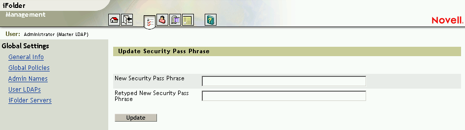 L'administrateur iFolder peut mettre à jour la phrase secrète de sécurité de l'utilisateur à partir de l'écran des règles globales du client. Celle-ci permet, en cas de nécessité, de récupérer la phrase secrète d'un utilisateur iFolder.