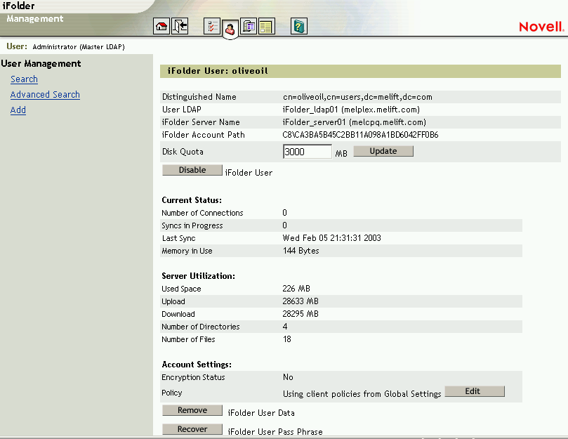 Pour afficher les paramètres de l'utilisateur, cliquez sur la console de gestion iFolder, puis sur User Management > {Search or Advanced Search} > User_ID (Gestion des utilisateurs > {Recherche ou Recherche avancée} > ID utilisateur)