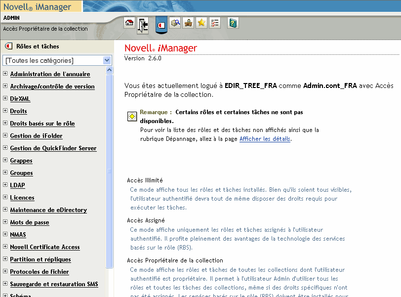 Aide : affiche des informations utiles concernant la page que vous consultez.Pour plus d'informations sur la manière de modifier la vue Rôles et Tâches par défaut, reportez-vous au Configuration et personnalisation de iManager.