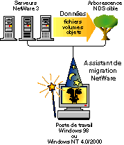 Novell® NetWare® Migration Wizard 6 copie et réunit dans une arborescence NDS® cible les objets Bindery et Système de fichiers NetWare 3 d'un ou plusieurs serveurs NetWare 3 existants.
