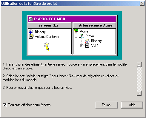 Le travail que vous devez accomplir s'effectue principalement dans la fenêtre de projet. Dans cette fenêtre, vous pouvez déplacer des objets de Bindery et des données de volume NetWare 3 vers des conteneurs NDS de l'arborescence NDS cible.