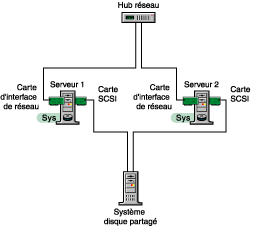 Bien que Fiber Channel constitue la configuration recommandée, vous pouvez configurer votre grappe pour qu'elle utilise la SCSI partagée. La figure ci-dessous montre à quoi peut ressembler une configuration de grappe SCSI partagée typique.