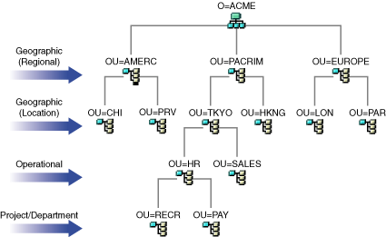 First-level Organizational Unit design is important because it affects the partitioning and efficiency of NDS. For networks that span more than one building or location using either a LAN or a WAN, the first-level Organizational Unit object design should be based on location. This allows you to partition NDS in a way that keeps all objects in a partition at one location. It also provides a natural place to make security and administrator assignments for each location. You should design the lower layers of the tree based on the organization of network resources. You have more freedom in designing the lower layers of an NDS tree than the upper layers because lower-layer design only affects objects at the same location. To create the lower layers of the tree, refer to "Creating and Manipulating Objects" in ConsoleOne User Guide. The number of lower-level container objects you create depends on the total number of objects in your tree and your disk space and disk I/O speed limitations. NDS eDirectoryTM has been tested with over 1 billion objects in a single NDS tree, so the only real limitations are disk space, disk I/O speed, and RAM to maintain performance. Keep in mind the impact of replication on a large tree. A typical object in NDS eDirectory is 3 to 5 KB in size. Using this object size, you can quickly calculate disk space requirements for the number of objects you have or need. Keep in mind that the object size will grow depending upon how many attributes are completed with data and what the data is. If objects will hold binary large object (BLOB) data such as pictures, sounds, or biometrics, the object size will subsequently grow. The larger the partitions, the slower the replication cycles. If you are using products that require the use of NDS, such as ZENworks and DNS/DHCP services, the NDS objects created by these products will affect the size of the containers they are located in. You might consider placing objects that are for administration purposes only, such as DNS/DHCP, in their own partition so user access is not affected with slower replication. Also, managing partitions and replicas will be easier. If you are interested, you can easily determine the size of your NDS eDirectory database or the Directory Information Base (DIB) Set.Creating Organizational Units That Represent the Physical Network