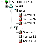 Dans cet exemple, l'icône de partition se trouve en regard de l'objet Arborescence. Cela signifie que cet objet est le conteneur le plus élevé dans la partition. Aucune icône de partition n'apparaît en regard des autres conteneurs, la seule partition est donc celle de l'arborescence.