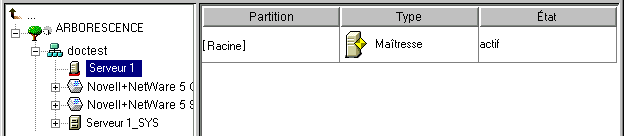 Dans cet exemple, remarquez que Serveur1 est sélectionné. Lorsque vous sélectionnez un serveur dans ConsoleOne et que vous affichez la vue Partition et réplique, les répliques présentes sur ce serveur apparaissent à droite. Dans ce cas, Serveur1 contient une réplique de la partition unique. Reportez-vous à Répliques.