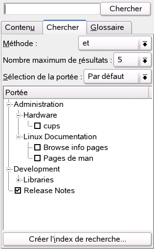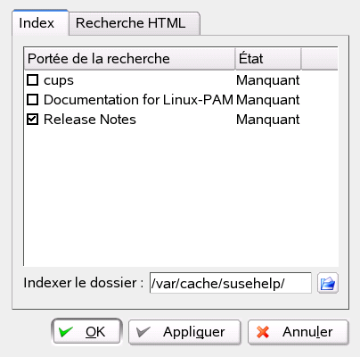 Si aucun index de recherche n'a été généré auparavant, le système vous invite automatiquement à le faire lorsque vous cliquez sur l'onglet Recherche ou que vous saisissez une chaîne de recherche, puis que vous cliquez sur Rechercher.Dans la boîte de dialogue permettant de générer l'index de recherche (Figure 9 ciaprès), utilisez les cases à cocher pour déterminer les sources d'informations à indexer.L'index est généré lorsque vous quittez la boîte de dialogue en cliquant sur OK.