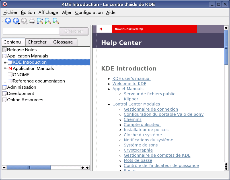 NLD est doté d'un Centre d'aide qui regroupe les guides de l'utilisateur NLD, toutes les sources d'information disponibles pour votre poste de travail, ainsi qu'une aide en ligne pour les programmes installés.Le centre d'aide permet aussi d'accéder aux pages man (de manuel) et info (d'informations) associées aux programmes de lignes de commande, ainsi qu'à l'aide des programmes graphiques.Pour accéder aux pages man et info, sélectionnez Aide> Manuel de l'utilisateur dans le tableau de bord de menus, puis cliquez sur les liens des pages de manuel et d'informations qui figurent sous l'en-tête Additional Documents (Documentation supplémentaire).