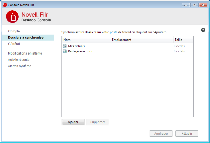 Lorsque vous configurez l'application de bureau Filr pour la première fois, vous pouvez choisir les dossiers à synchroniser. Les dossiers Mes fichiers et Partagé avec moi sont synchronisés par défaut. En revanche, la synchronisation des dossiers réseau et publics doit être configurée manuellement. Vous pouvez configurer les dossiers à synchroniser pendant la configuration initiale ou à tout moment après cette configuration.