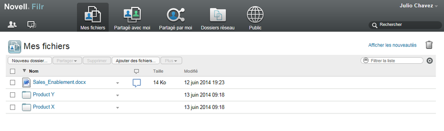 Lorsque vous lancez Novell Filr dans un navigateur Web pour la première fois, la page Mes fichiers s'affiche. Vous pouvez gérer tous les fichiers créés depuis cette page.