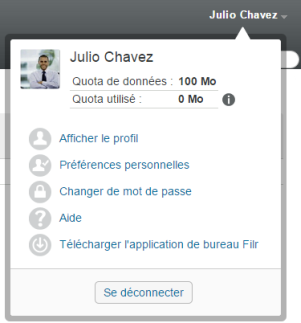 Lien de nom : cliquez sur le lien dans le coin supérieur droit d'une page Filr pour afficher les options suivantes :