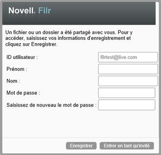 L'utilisateur doit ensuite s'enregistrer sur le site Filr pour se connecter. (Avant Filr 1.1, les utilisateurs pouvaient se connecter au site Filr à l'aide de leur compte Google ou Yahoo. Dans Filr 1.1 ou version ultérieure, cette fonctionnalité n'est plus disponible pour les nouveaux utilisateurs. Pour plus d'informations concernant cette modification, consultez le fichier lisezmoi de Novell Filr 1.1.