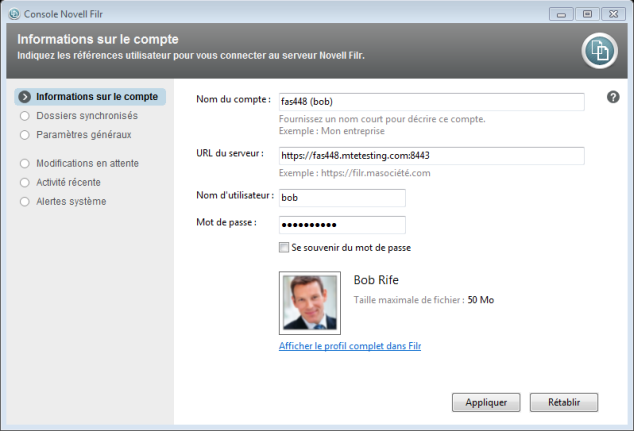 URL du serveur : indiquez l'URL du site Filr où vous souhaitez synchroniser des fichiers sur votre ordinateur. Par exemple, https://Filr.masociete.com.