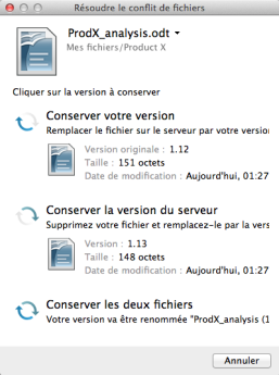 Conserver votre version : remplace le fichier sur le serveur Filr par votre version.