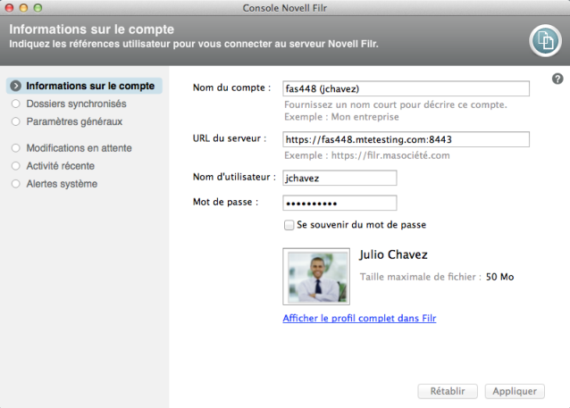 Lors de la configuration initiale de l'application de bureau Filr, vous pouvez indiquer les informations sur le compte et celles du serveur Filr.