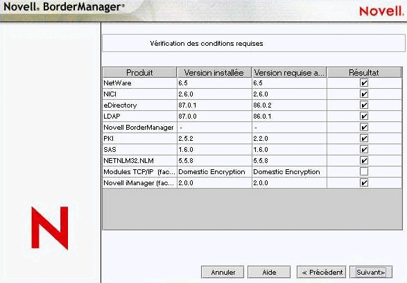 Si les éléments minimum, à l'exception des modules TCPIP ou d'iManager 2.0, n'existent pas, l'installation échoue. Assurez-vous de répondre aux exigences de configuration en fonction des informations de la figure ci-dessus et relancez de nouveau l'installation. Si les éléments de base des modules TCPIP n'existent pas, un message d'avertissement s'affiche. Vous pouvez ignorer l'avertissement et effectuer l'installation, mais vous devez toutefois copier les modules TCPIP appropriés (reportez-vous à la section Conditions d'installation de Novell BorderManager 3.8) si vous voulez utiliser les services VPN.