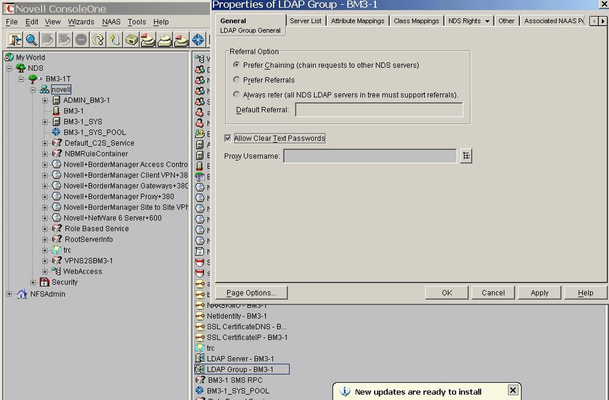 Pour activer les mots de passe en texte claire, loguez-vous à ConsoleOne, double-cliquez sur le contexte du serveur sur lequel vous installez Novell BorderManager 3.8, sélectionnez l'objet Groupe LDAP et cliquez avec le bouton droit sur > Propriétés. Si nécessaire, cochez la case Permettre les mots de passe en texte clair (pour eDirectory 8.6.2) ou désélectionnez l'option Exiger TLS en cas de liaison simple avec mot de passe (pour eDirectory 8.7.1).