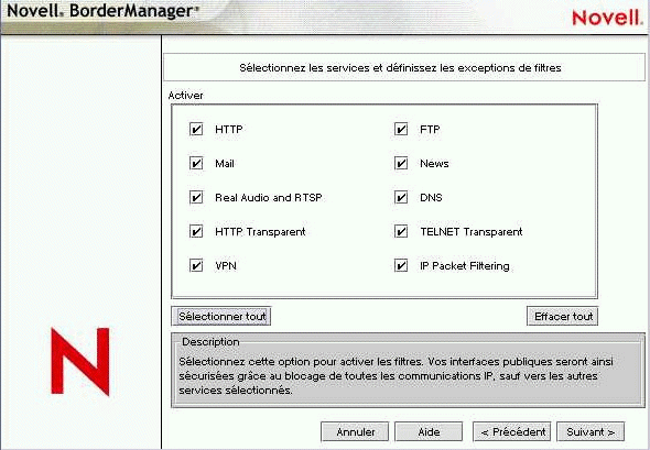 La page suivante contient les services Novell BorderManager 3.8 qui vont être installés. Ces services sont les suivants :