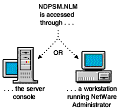 The NDPS Manager object stores information used by the NetWare® Loadable ModuleTM (NLMTM), NDPSM.NLM. You can manually load this NLM at the server console, or it will be automatically loaded when you create a Printer Agent with NetWare Administrator.