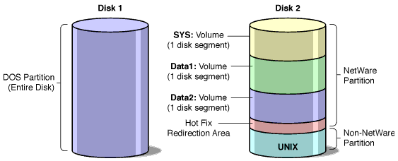 A hard disk can contain as many as four partitions, including a DOS partition, multiple NetWare partitions, or non-NetWare partitions (such as Windows NT or UNIX). The disk can also contain free space assigned to the NSS file system.