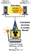 La figure ci-dessous illustre la gestion de la migration de données d'un serveur NetWare 3 vers un serveur NetWare 5.1 au moyen de l'Assistant de mise à jour.