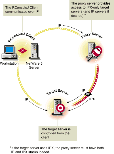 Before you can run RConsoleJ, you must prepare the target server to communicate with RConsoleJ. If the target server communicates using IPX, you must also prepare a proxy server to handle the IPX connection. The proxy server must have both IP and IPX loaded. Each of these tasks is explained in the following procedures.