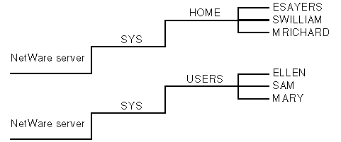 These are work directories for groups and users to keep work files in. You can also create a directory to transfer files between directories on the network. Although data can be created and stored in a home or user directory, when data is stored in a user's directory, no other user (except network administrators or managers assigned file rights) can access it. So, to allow users to share data, create work directories and make trustee assignments for groups or users who need access to these directories. To provide personal workspace for users, create home or username directories. You can create a parent directory in volume SYS: called HOME or USERS. Or, you can create a separate HOME or USERS volume. Then you can create a subdirectory for each user. The name of each subdirectory should be the username. Usernames can be up to 47 characters, but DOS displays only 8 characters in a one-level directory name. The following figure shows this type of directory structure. Figure 7 Directories Created During NetWare Installation