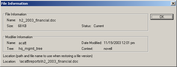 Modifier Information (Informations sur le modificateur) : ces informations incluent le nom d'utilisateur de l'auteur de la dernière modification du fichier ainsi que la date de modification. Elles comprennent également l'arborescence Novell eDirectoryTM et le contexte du modificateur.
