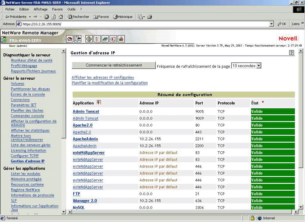 La page Gestion d'adresse IP liste les applications actuellement configurées dans la structure. Elle facilite la résolution des conflits d'adresses IP et de ports des applications qui s'exécutent sur NetWare 6.5.