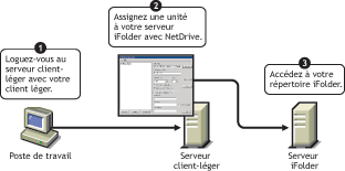 Une fois NetDrive installé sur votre serveur " client léger ", un utilisateur mobile peut s'en servir pour assigner une unité au serveur iFolder ; la copie de ses données iFolder est ainsi accessible via l'Explorateur Windows. (Pour une représentation visuelle de cette procédure, reportez-vous à l'Etape 9.)