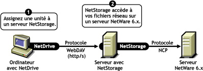 Dans ce scénario, NetDrive vous permet d'utiliser des protocoles Internet conviviaux (WebDAV sur HTTP) pour assigner une unité à un serveur NetWare via NetStorage. NetStorage utilise le protocole NCPTM (Novell Core Protocol) pour accéder au serveur NetWare, lit votre script de login, puis affiche tous vos fichiers et unités assignés depuis un emplacement central.