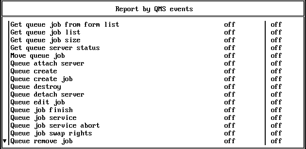 Report by QMS events. This filter shows the print and queue events that are included in the current filter. Because of the screen size, only 16 events are shown at one time, with the remainder of the events available using the Page Up and Page Down and arrow keys.