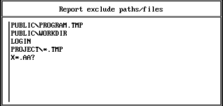 This filter allows you to specify one or more files or directories that you wish to exclude from audit reports. All other files and directories are potentially included in the report. Only those files and directories named are excluded. That is, if you exclude \FOO, that does not also exclude \FOO\BAR. For instructions, see Report Exclude Paths/Files. |