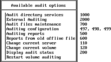 When you run AUDITCON, it displays a screen with an Available audit options menu as shown in Figure 7. There are five such top-level menus. The one AUDITCON displays depends on four variables: