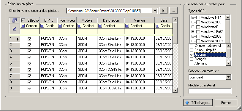 Le système télécharge les pilotes sélectionnés dans la base de données des pilotes.