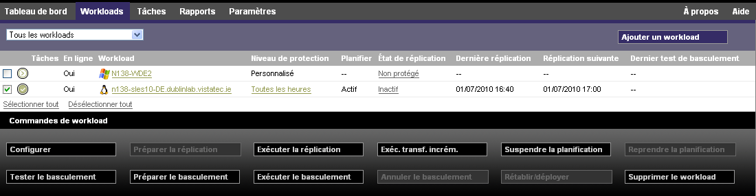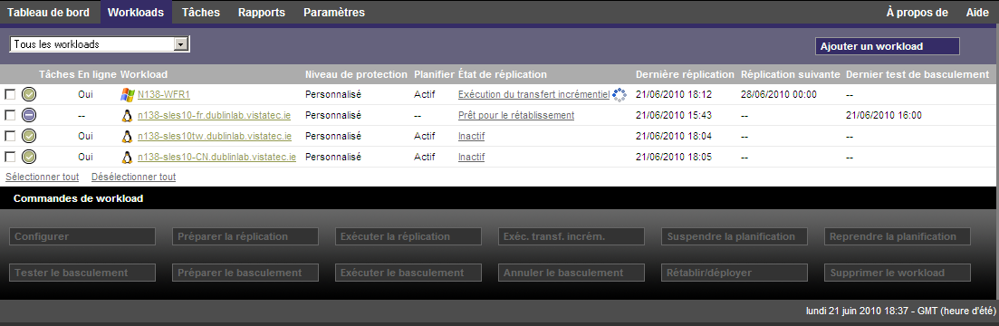 REMARQUE :tous les tampons horaires font référence au fuseau horaire de la VM PlateSpin Forge, lequel peut être différent du fuseau horaire du workload protégé ou de celui de l'hôte sur lequel vous exécutez le client Web PlateSpin Forge. La date et l'heure du serveur s'affichent en bas en droite de la fenêtre du client.