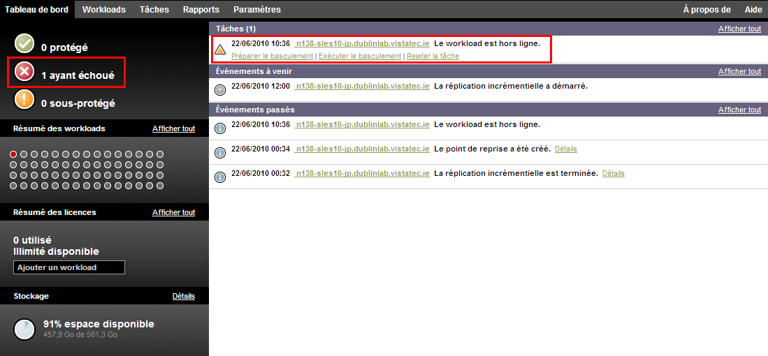 Figure 5-1 Page Tableau de bord en cas de détection d'un échec de workload