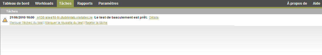 Indiquez si le test a réussi ou échoué. Utilisez les commandes correspondantes dans la tâche (, ). L'opération sélectionnée est enregistrée dans l'historique des événements associés au workload. L'option rejette la tâche et l'événement.